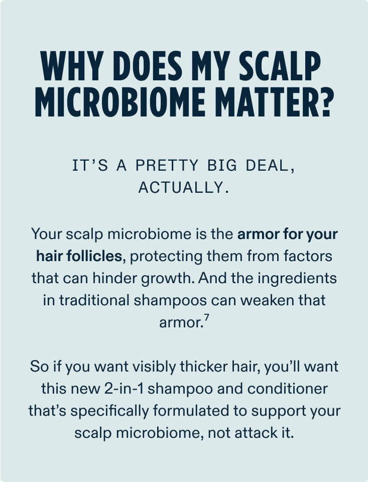 This formula is physician-developed for thinning hair and is the first certified microbiome-friendly 2-in-1 for men. It provides a deep cleanse without stripping the scalp and uses 100% natural fragrance. Konjac Root delivers silicone-free conditioning that enhances fullness and volume without heaviness. In contrast, many traditional men’s shampoos contain sulfates, synthetic fragrances, and heavy silicones that may disrupt the scalp microbiome, contribute to dryness or irritation, and weigh the hair down.